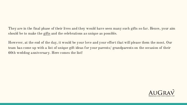 Get anniversary gift ideas and send romantic marriage anniversary gifts we have traditional gifts and goodies for those celebrating their 50th or 60th wedding anniversary too gift ideas for parents wedding anniversary. 60 years is a really long time and by living together for this long, they have.